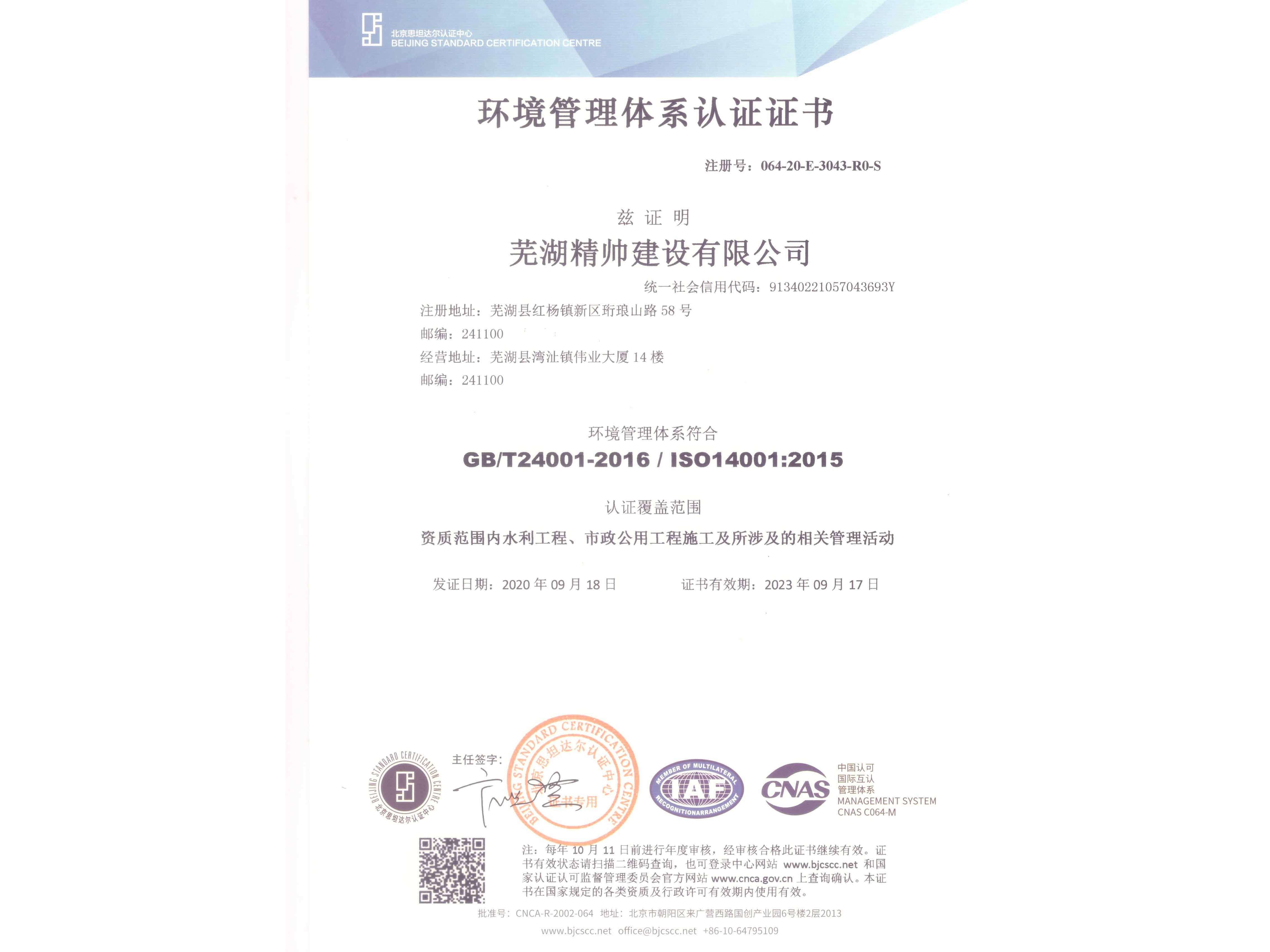 环境管理体系认证证书